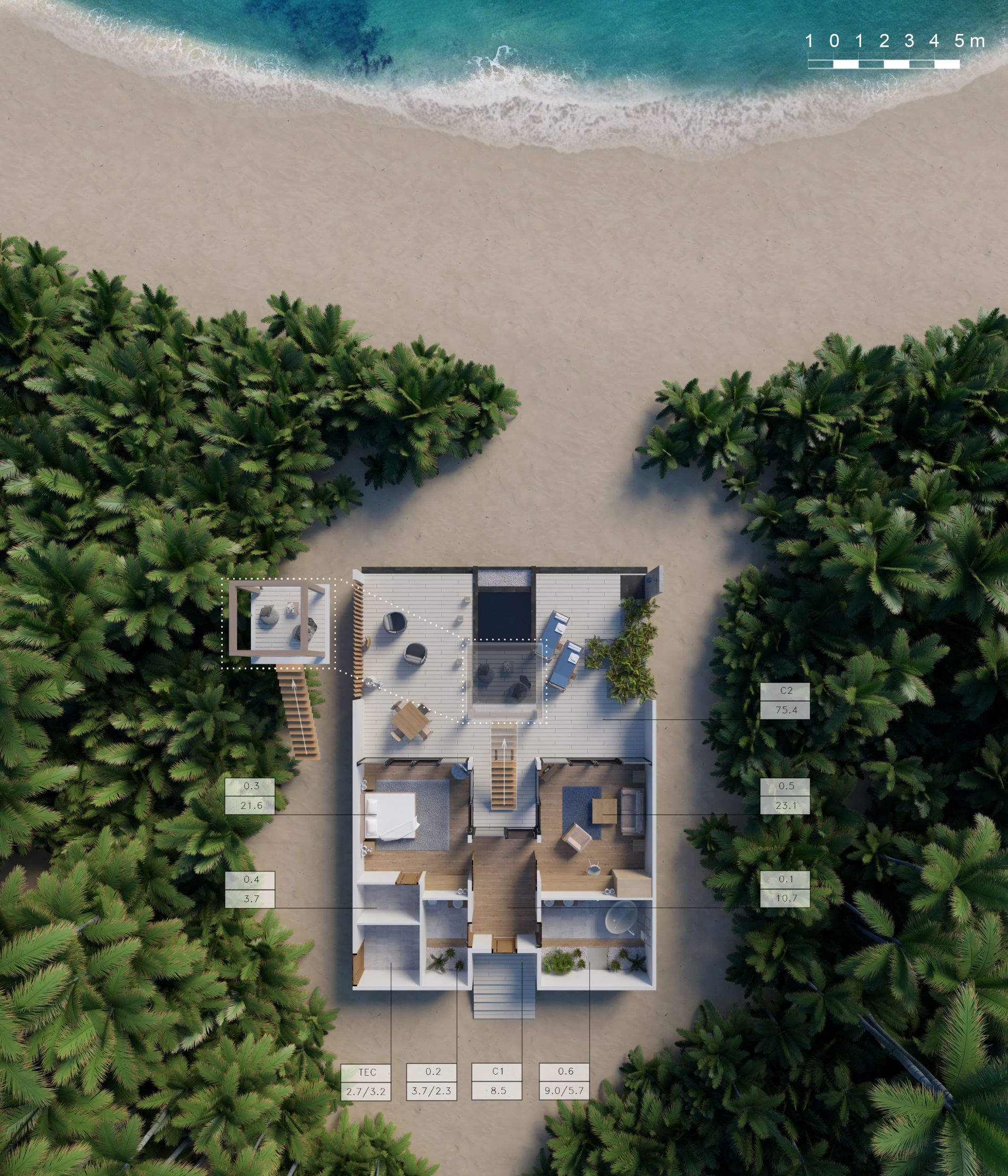 Площадь номера — 190 кв.м. Двухуровневые береговые виллы с бассейном и видом на закат. Состоят из спальни с большой двуспальной кроватью; ванной комнаты с отдельной ванной и открытым душем; просторной гостиной с гостиной; павильоном для отдыха на втором этаже; террасы с бассейном, лежаками, обеденной зоной, открытым душем и выходом на пляж.
